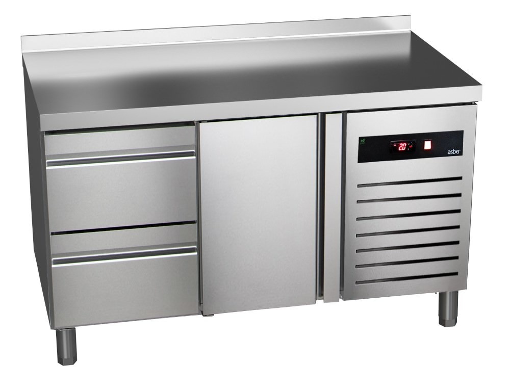 Single Door Refrigerated Table with Splashback and 2 Drawers 128 L, from -2 °C to 8 °C, Side-Mounted Compressor