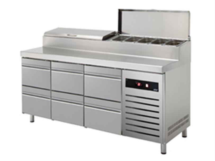 Six drawers Pizza Prep Table, 428 L 8-10 x GN 1/4 Extenssion, Side-Mounted Compressor
