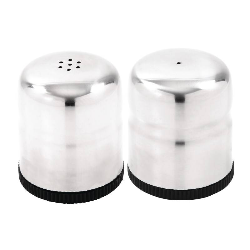 Set of stainless steel salt and pepper shakers. 60(H) x 70(Ø)mm.
