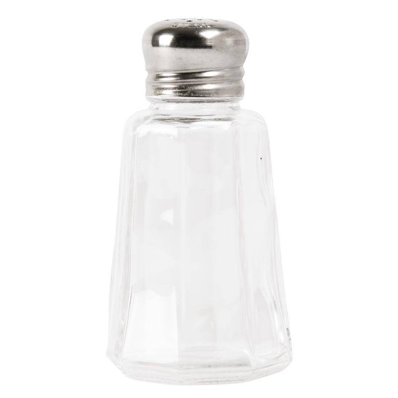 A box of twelve clear glass salt and pepper shakers with mushroom shaped lids, ideal for table centres in restaurants and bars. Suitable for use with table organiser, C159, sold separately.