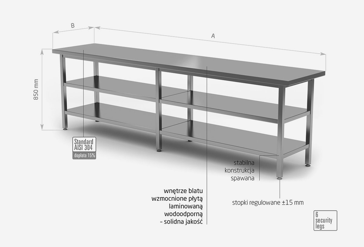 As standard, our products are made of AISI 430 stainless steel, and the elements exposed to the strongest chemical and organic agents are made of acid resistant steel AISI 304. All our furniture can also be made entirely of this material, surcharges to the AISI 304 standard have been given for each piece of furniture.
