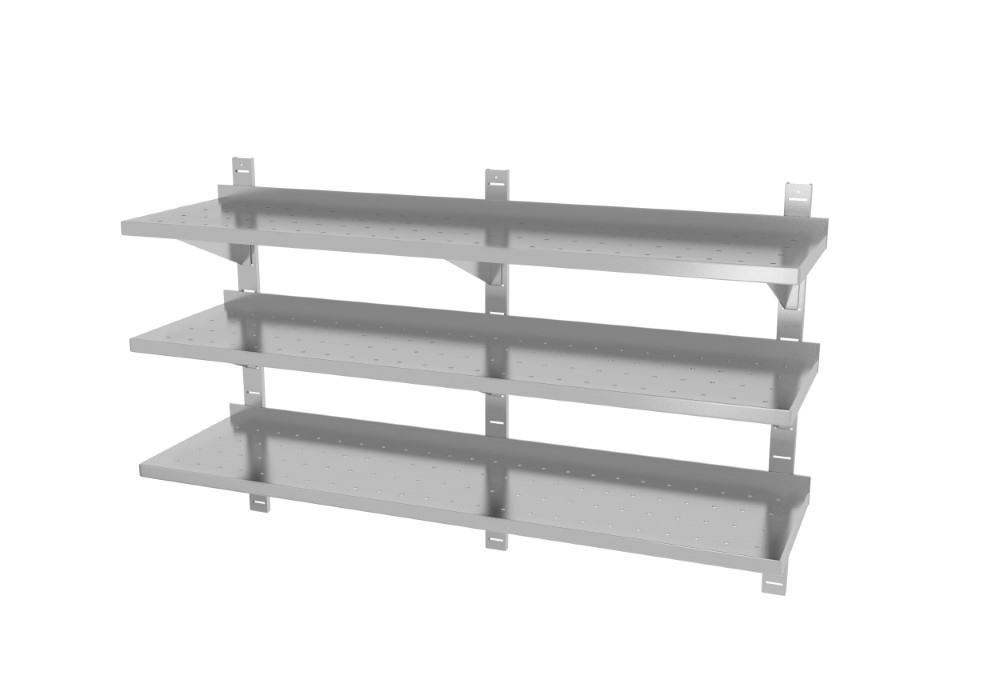Stainless steel hanging shelf with three adjustable perforated shelves - with three brackets, dimensions 1900x300x(h)875 mm