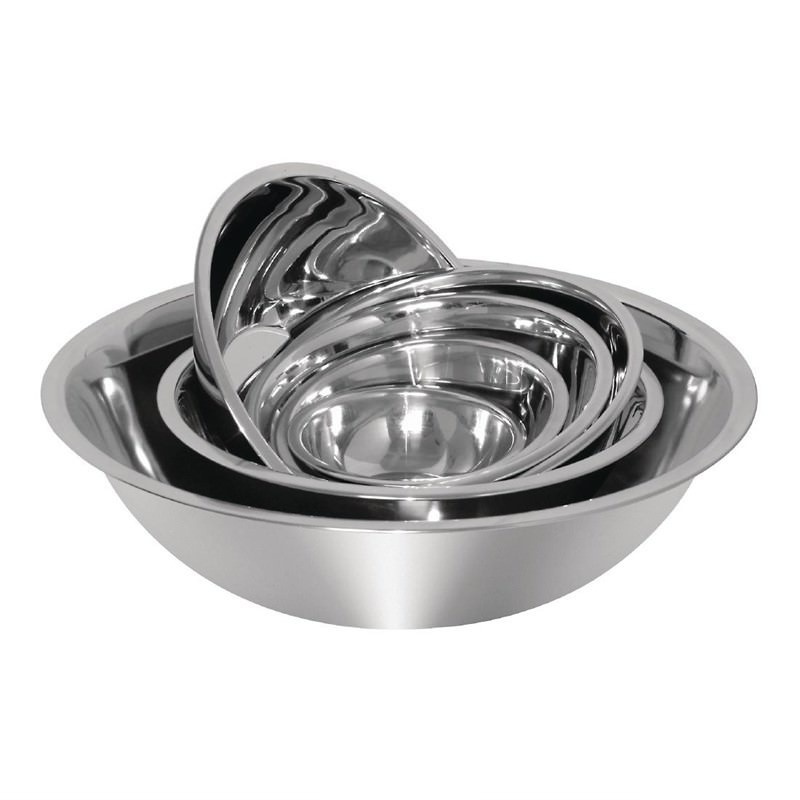 Faster mixing, less mess - using this 2.2-litre mixing bowl from Vogue is guaranteed to increase your speed and efficiency during food prep. Designed with a large flat base, the bowl is incredibly stable on your work surface and keeps you in complete control at all times. This allows you to mix or beat your ingredients quickly without spilling them. Made from premium stainless steel, the bowl has the commercial strength and reliability required to excel in a professional kitchen. It's fully stackable too, helping you make the most of your storage space.