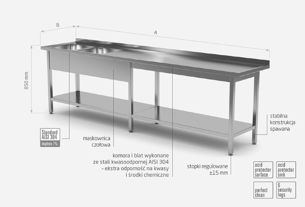 - sinks and worktop made of acid-resistant stainless steel AISI 304 with high resistance to acids and chemicals,