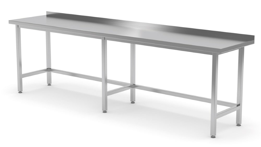 Stainless steel reinforced work table with splashback without shelf, dimensions 2600x600x(h)850 mm