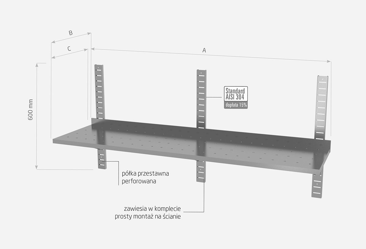 Stainless steel single adjustable hanging perforated shelf - with three brackets, dimensions 2000x300x(h)600 mm