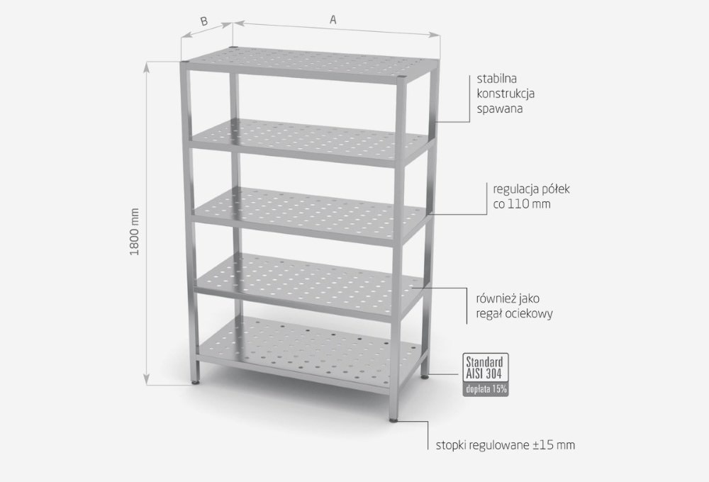 As standard, our products are made of AISI 430 stainless steel, and the elements exposed to the strongest chemical and organic agents are made of acid resistant steel AISI 304. All our furniture can also be made entirely of this material, surcharges to the AISI 304 standard have been given for each piece of furniture.