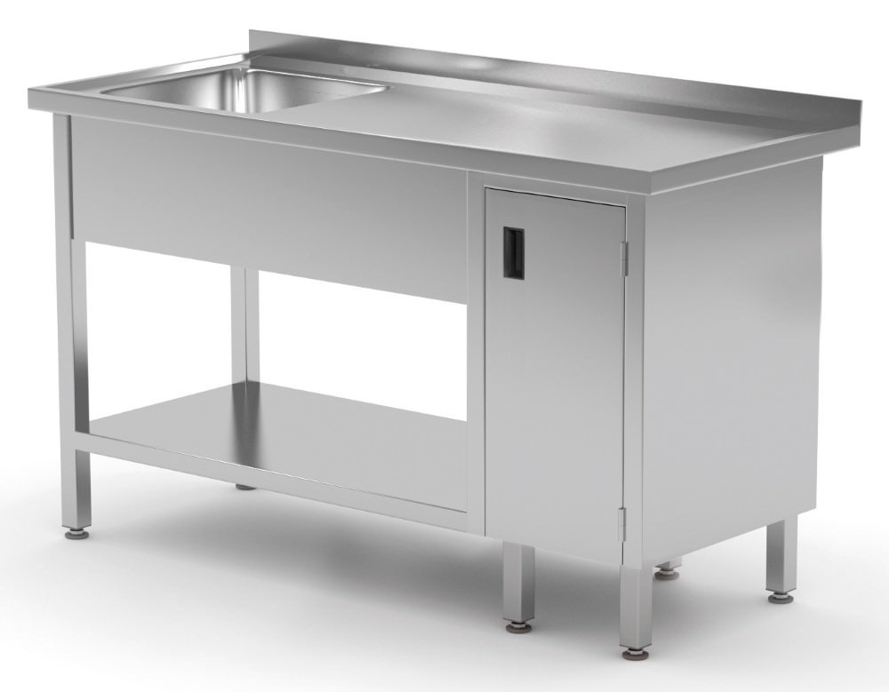 Stainless steel table with sink, undershelf and cabinet with hinged door - sink on left side, dimensions 1400x600x(h)850 mm