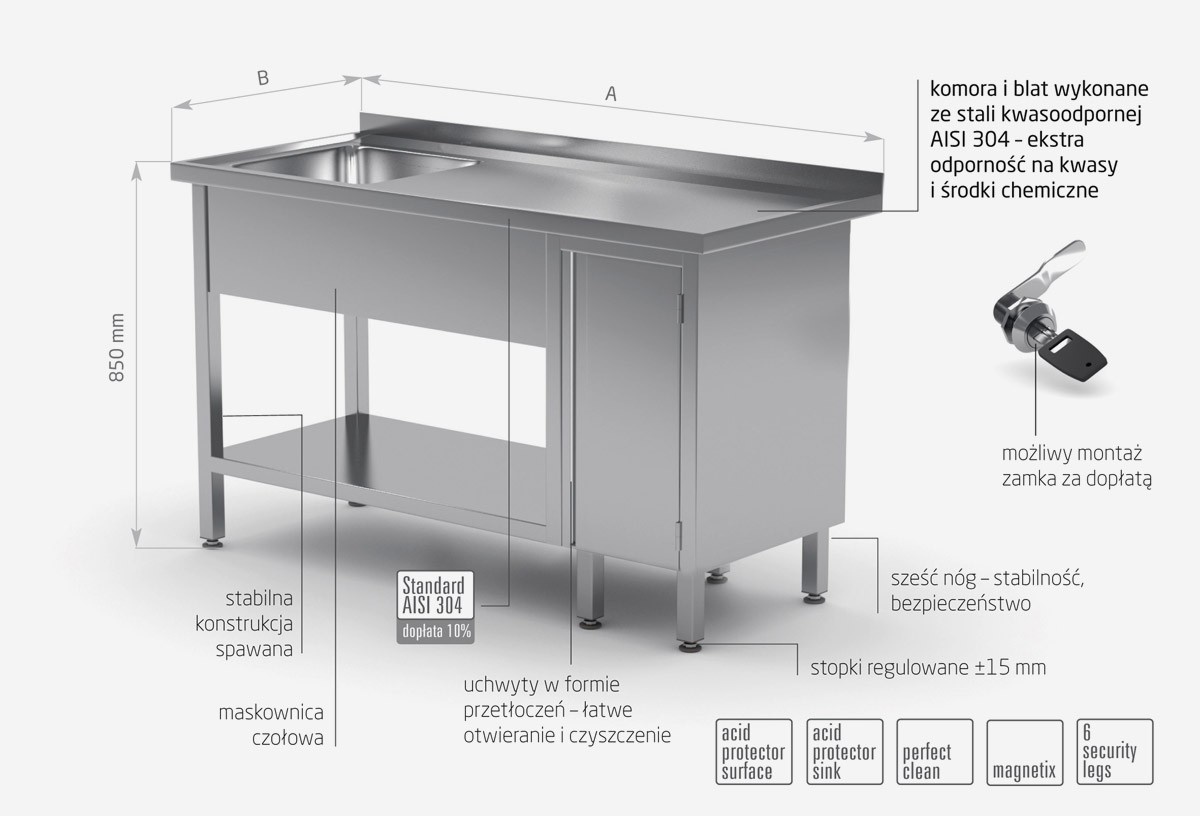 - sink and table top made of acid-resistant stainless steel AISI 304 with high resistance to acids and chemicals,