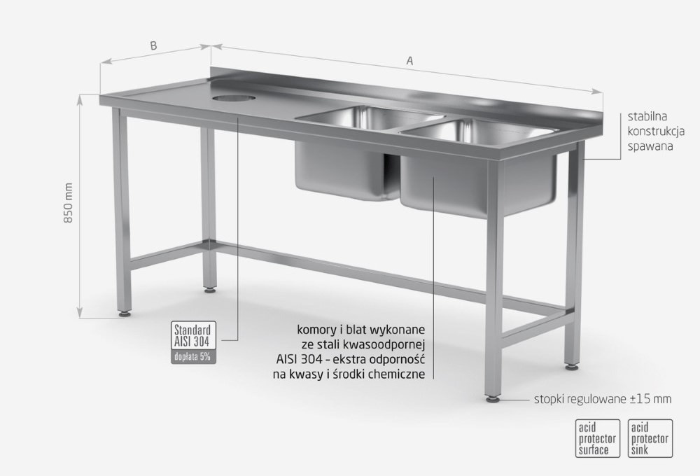 - sinks and worktop made of acid-resistant stainless steel AISI 304 with high resistance to acids and chemicals,