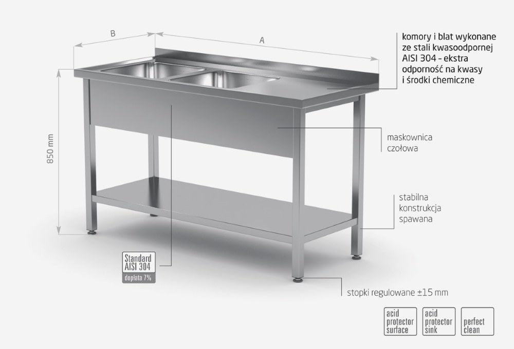 - sinks and worktop made of acid-resistant stainless steel AISI 304 with high resistance to acids and chemicals,