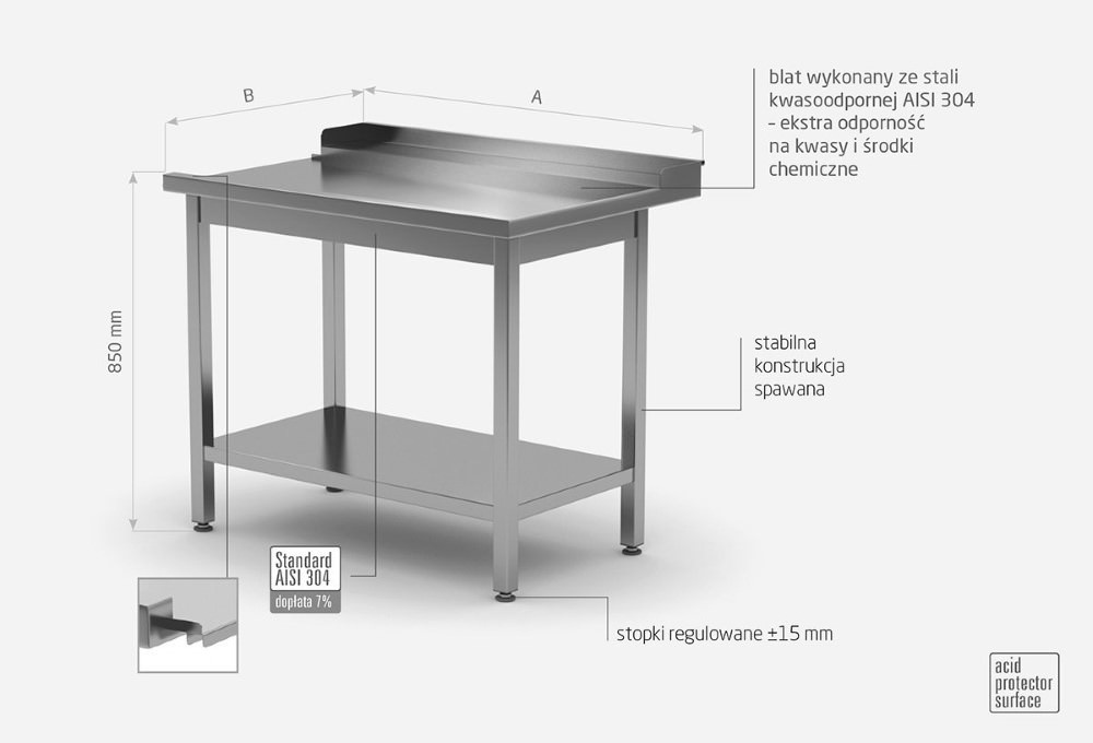 - table top made of acid-resistant stainless steel AISI 304 with high resistance to acids and chemicals,
