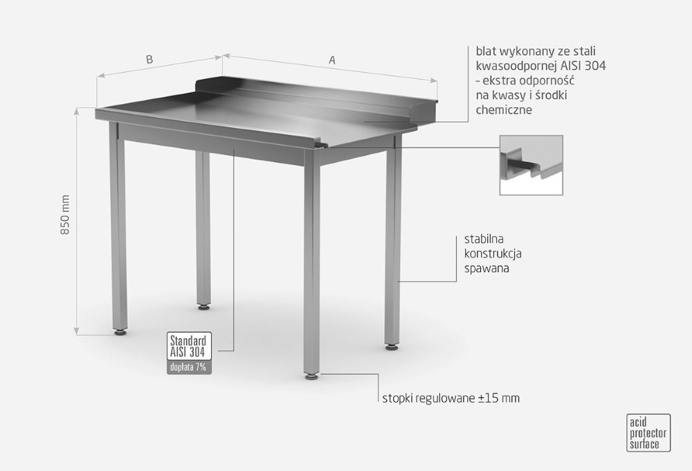 - table top made of acid-resistant stainless steel AISI 304 with high resistance to acids and chemicals,