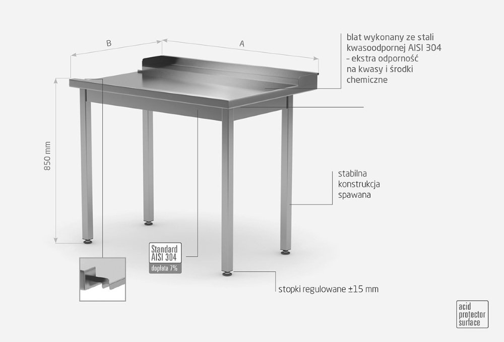 - table top made of acid-resistant stainless steel AISI 304 with high resistance to acids and chemicals,