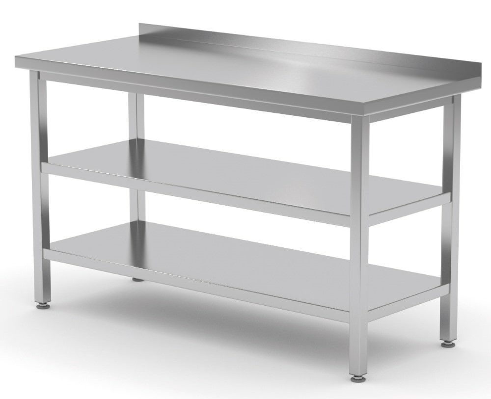 Stainless steel work table with splashback and two undershelves, dimensions 600x700x(h)850 mm