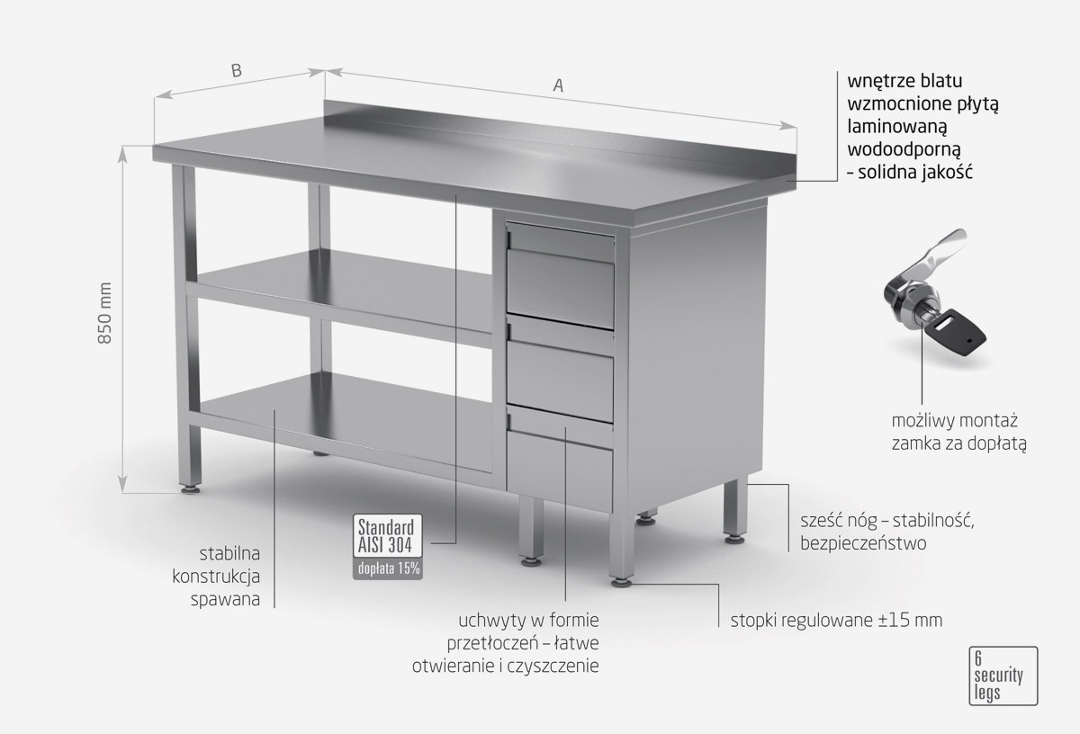 Stainless steel work table with splashback, cabinet with three drawers and two undershelves - drawers on right side, dimensions 1500x700x(h)850 mm