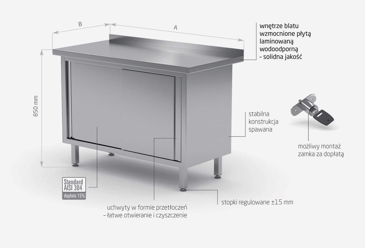 As standard, our products are made of AISI 430 stainless steel, and the elements exposed to the strongest chemical and organic agents are made of acid resistant steel AISI 304. All our furniture can also be made entirely of this material, surcharges to the AISI 304 standard have been given for each piece of furniture.