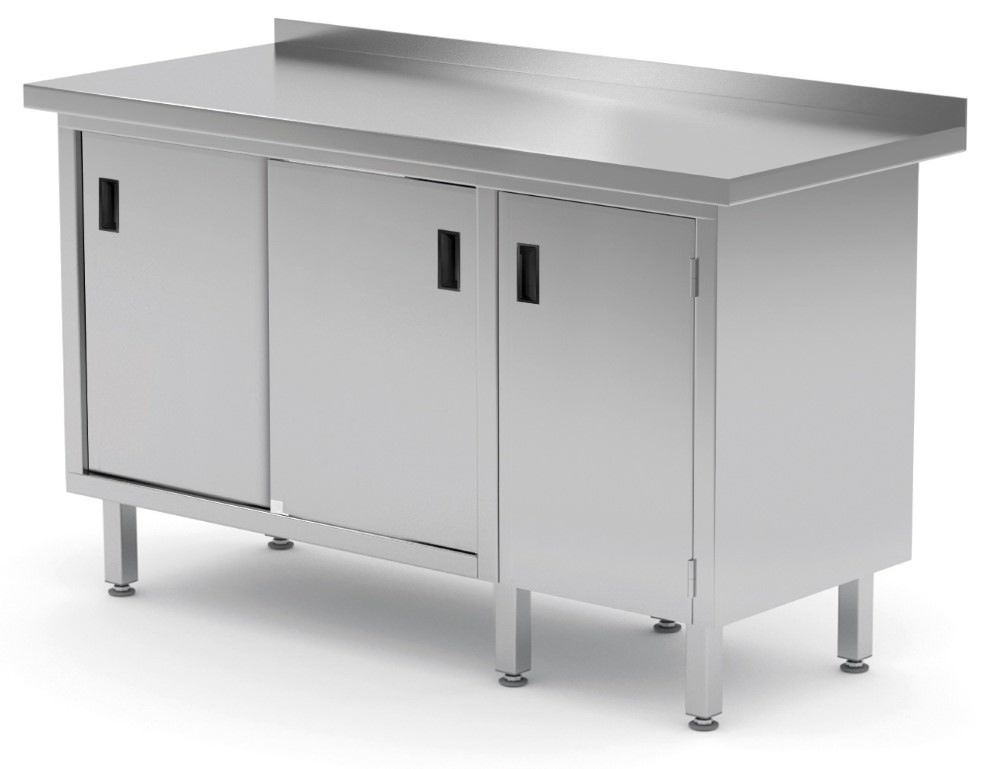 Stainless steel work table with splashback, cabinet with sliding doors and hinged door - hinged door on the right, dimensions 1200x700x(h)850 mm