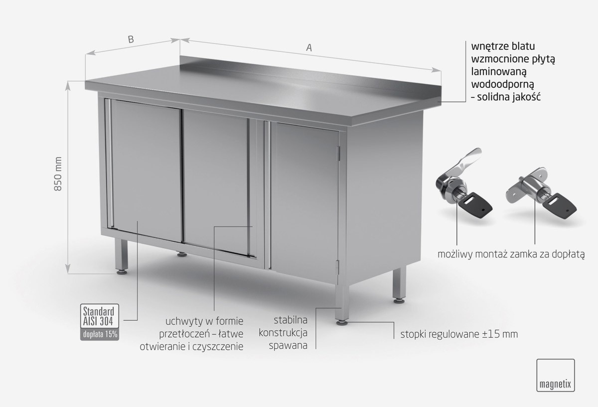 Stainless steel work table with splashback, cabinet with sliding doors and hinged door - hinged door on the right, dimensions 1600x600x(h)850 mm