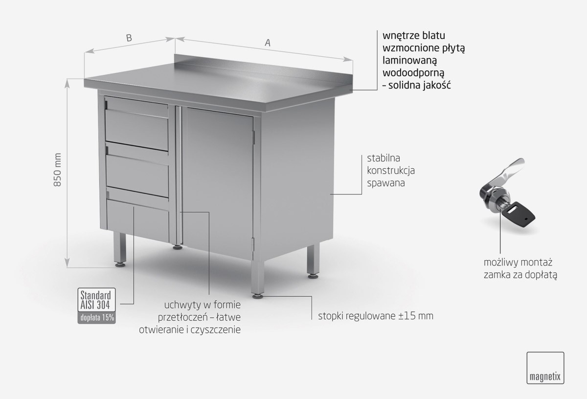 As standard, our products are made of AISI 430 stainless steel, and the elements exposed to the strongest chemical and organic agents are made of acid resistant steel AISI 304. All our furniture can also be made entirely of this material, surcharges to the AISI 304 standard have been given for each piece of furniture.