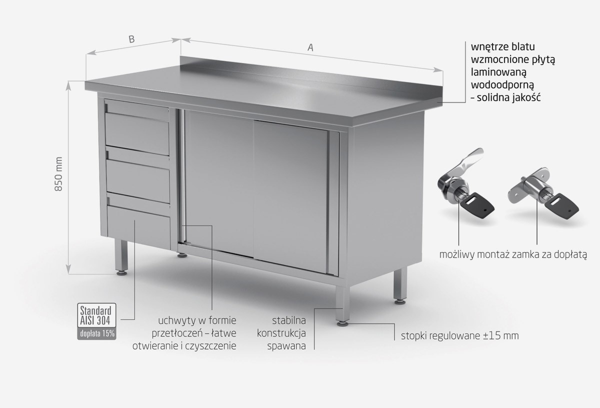 Stainless steel work table with splashback, cabinet with three drawers and sliding doors - drawers on left side, dimensions 1800x700x(h)850 mm