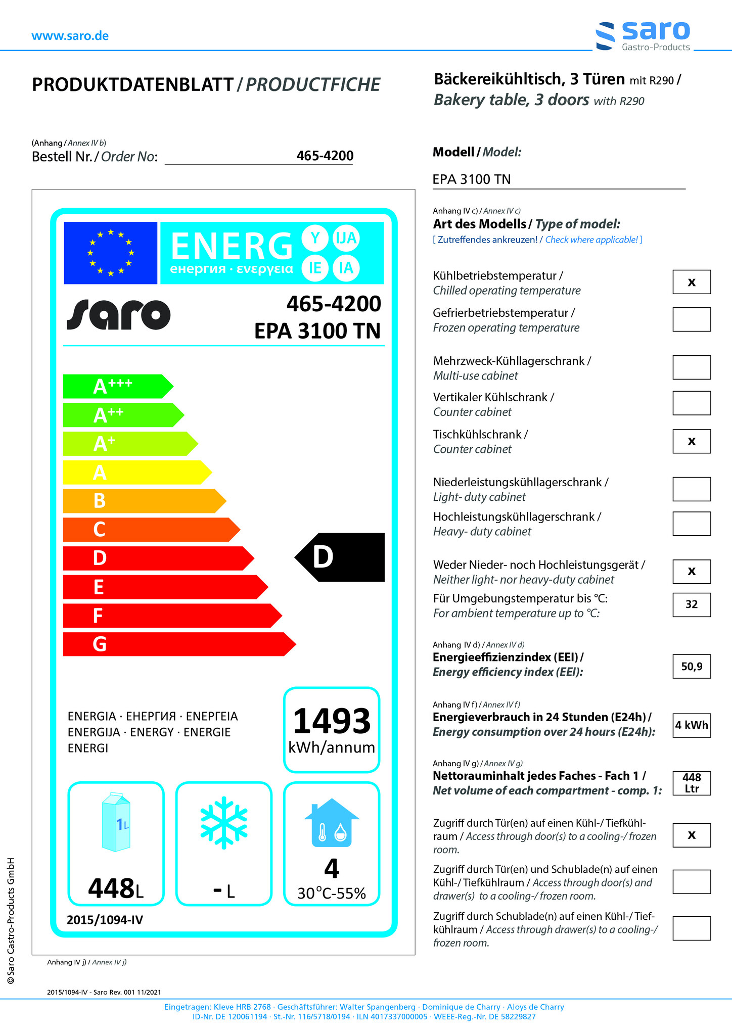 Stół chłodniczy 3-drzwiowy 1051 L, od 2 °C do 10 °C, agregat boczny