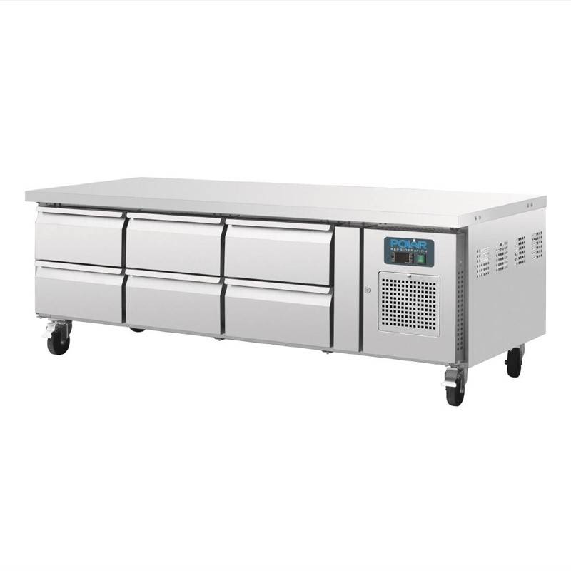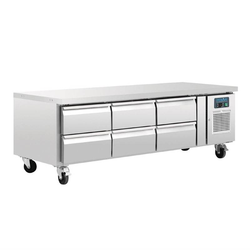 Ideal for use in any fast-paced commercial kitchen, the Polar U-Series six drawer chef base fridge offers impressive performance and reliability. Featuring a powerful forced air cooling system and precise digital temperature control, the unit is designed to outperform in unusually hot environments - even when the door is frequently being accessed. The counter also boasts space for up to six 1/1 GN pans in the sturdy easy-slide drawers - great for easy-access storage of your most required ingredients. Thanks to its low height, the chef base can accommodate other heavy appliances such as grills or induction hobs - perfect for freeing up additional kitchen space.