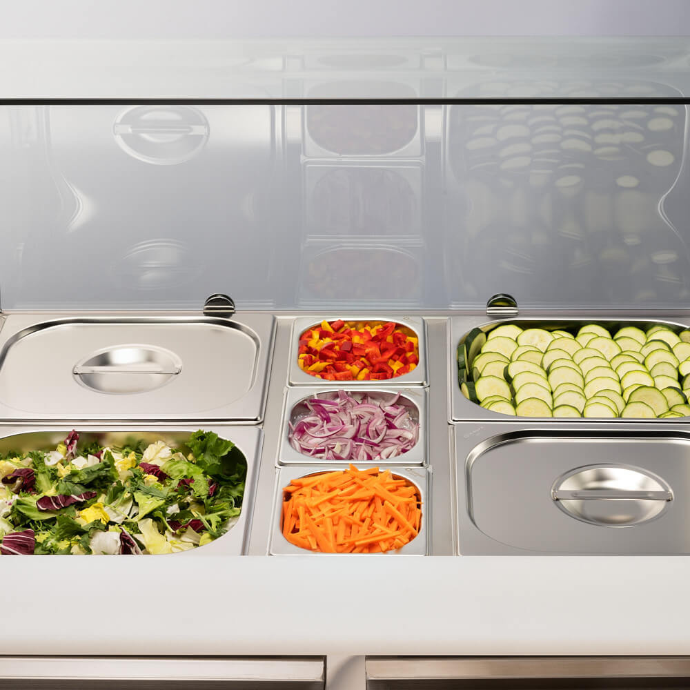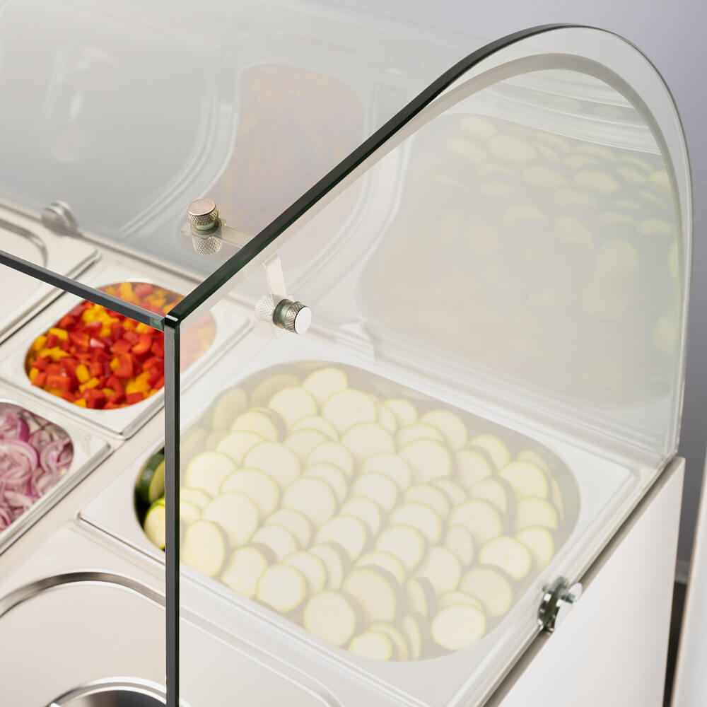 Stół chłodniczy sałatkowy 2-drzwiowy 10x 1/4 GN 240 L, ze szklaną nadstawą 2 do 8°C, agregat na dole