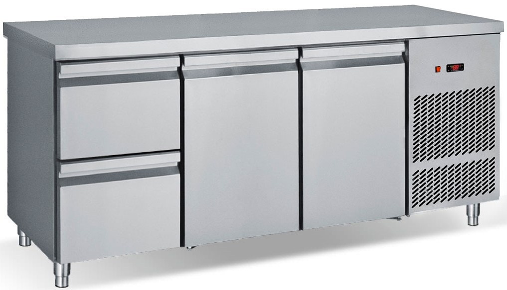 HomeRefrigerationRefrigerated TablesWorktop RefrigeratorsStół chłodniczy z 2-drzwiami i 2 szufladami 226 L, od 0 °C do 10 °C, agregat boczny