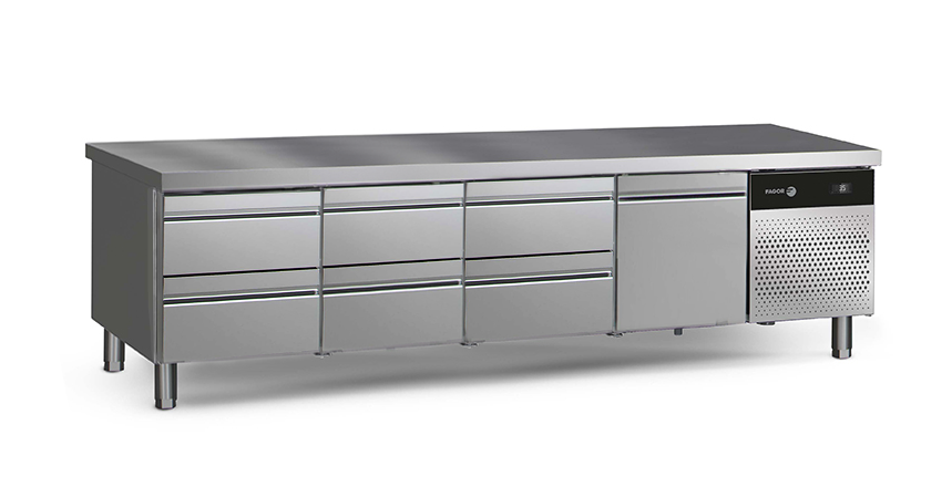 Stół chłodniczy z drzwiami i 6-szufladami 377L, od 0 °C do 8 °C, agregat boczny