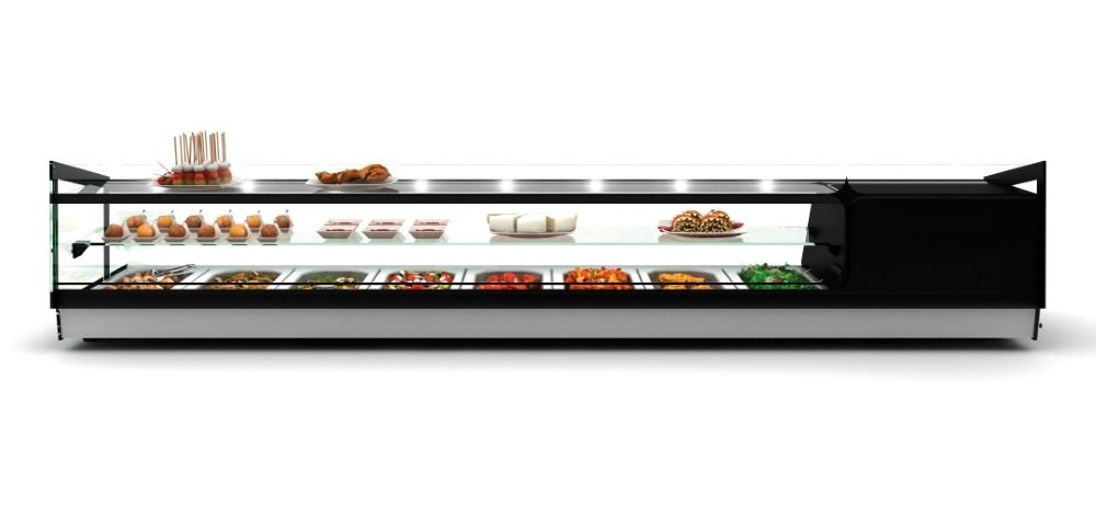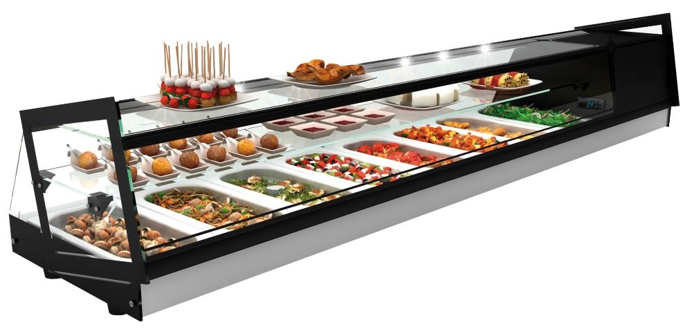 3 levels (cooled GN containers, inner glass shelf, top shelf) • +2°C up to +5°C in the tub area • all glasses strengthened • digital temperature display • LED lighting • quality compressor • GN containers not included • for 8x 1/3 GN 40 mm deepSpecifications