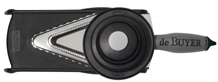 PROFESSIONAL Stainless steel and polypropylene, Professional quality blade made in Thiers. New "Click Express" system new thickness adjustment system, quickly, safely and efficiently allowing to cut extra-fine slices from 0.2 mm to 5 mm. (space of 0.2 mm) EFFECTIVE The blade easily penetrates into the product. Micro-serrations of the blade make it easier to cut all fruit/vegetables into very thin slices, while preserving the constitution of their flesh. 19.3° optimised cutting angle. Easily and perfectly cuts even the softest fruit and vegetables (tomatoes, pears, etc.). CONVENIENT & EASY The stainless steel plate enables food to slide smoothly for a natural movement. The knob incorporated into the handle end lets you adjust the thickness up to 5 mm. Ergonomic handle for a natural grip. SAFE Protective pusher: no contact with the blade during use. Anti-slip handle. Stability when cutting thanks to anti-slip legs. Care: wash by hand.