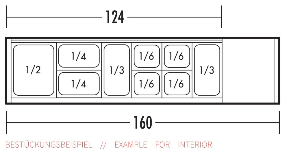 length of basin 1240 mm • GN container up to 150 mm depth • cooling output 180 kcal/h • stainless steel casing • glass cover • static cooling in the tub area +2° up to +8°C • GN containers not includedSpecifications