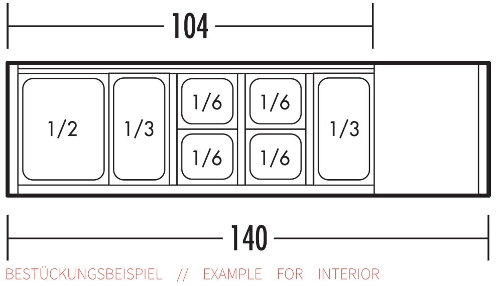length of basin 1040 mm • GN container up to 150 mm depth • cooling output 170 kcal/h • stainless steel casing • glass cover • static cooling in the tub area +2° up to +8°C • GN containers not includedSpecifications