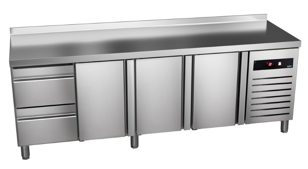 Tripple Door Refrigerated Table with Splashback and 2 Drawers 270 L, from -2 °C to 8 °C, Side-Mounted Compressor