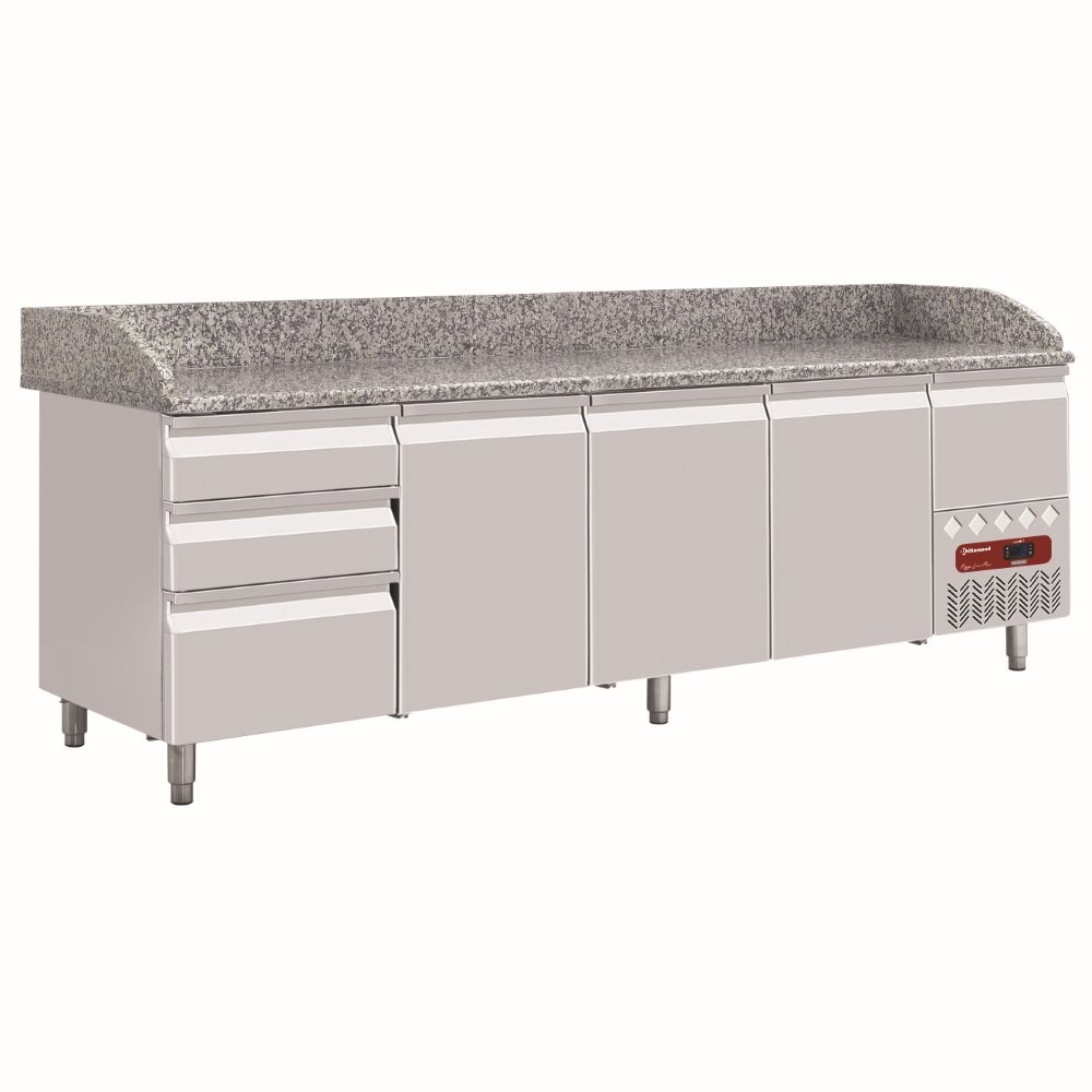 Tripple Doors Pizza Prep Table with 3 drawers with Granite Top, Side-Mounted Compressor