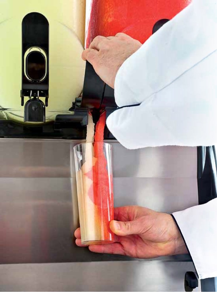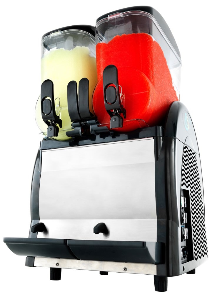 With a single movement you combine 2 flavours to create fantastic cocktails. Turn the glass meanwhile for the Twist Effect. • slush machine with 2 seperate taps and Twist Combi Tap System • also suitable for smoothies and fruit purree • capacity 2x 12 liters • FAST FREEZE: improved refrigeration system reduces the preparation time considerably • lighting • optimised containers with reduced egdes for a better mix result and easy cleaning • improved easy removable taps for easy cleaning • stirrer • electronic thermostat with 3 levels: freezing, cooling, only stirring • condensate channeling systemSpecifications