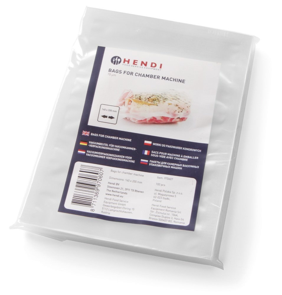 2-ply, inside layer made from food contact approved Polyethylene, outside layer made from Polyamide (Nylon). Total thickness is 65 µm. Suitable for chamber vacuum packing machines.