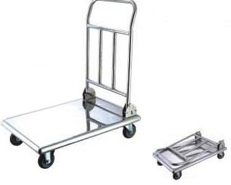 The folding platform truck with four steering wheels (2 brake). Platform with embossed, profiled lipping safety against sliding of transported products. The design of self-assembly.