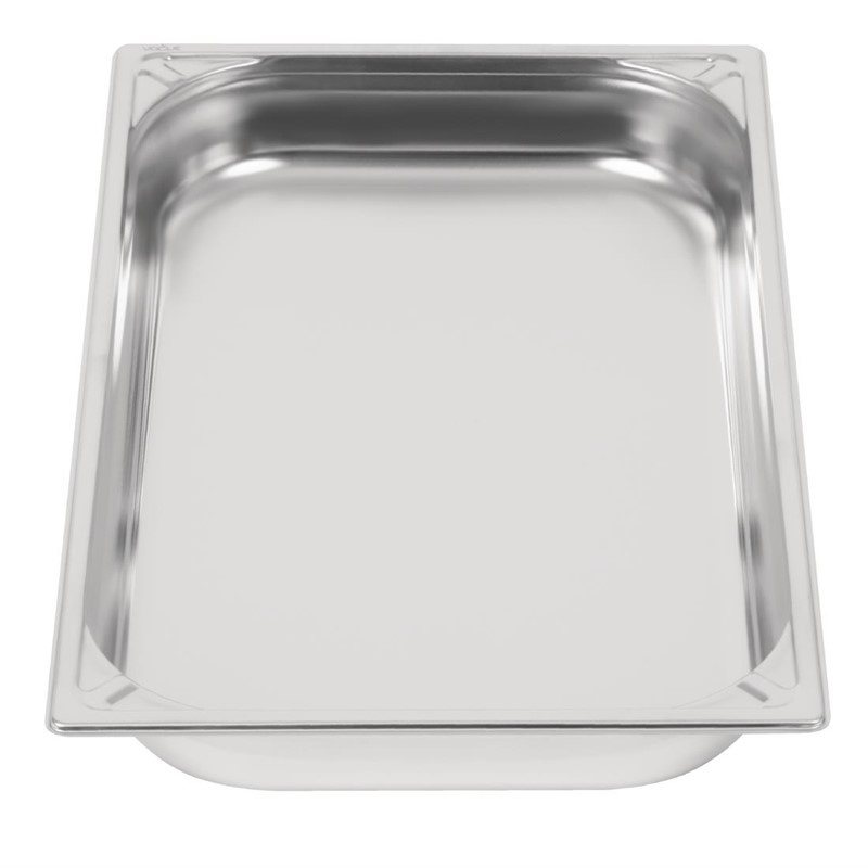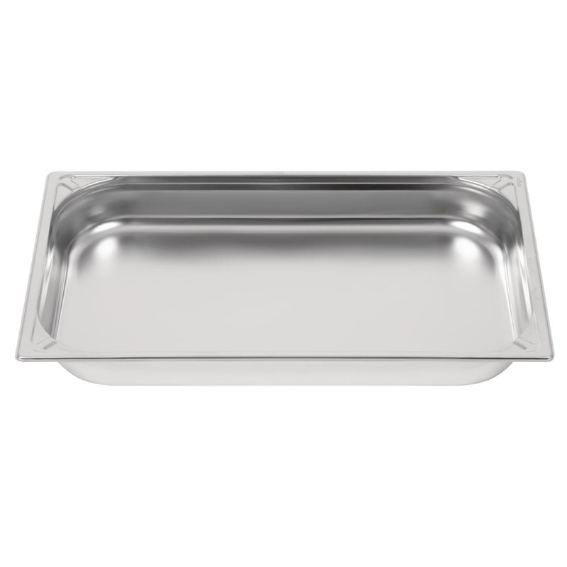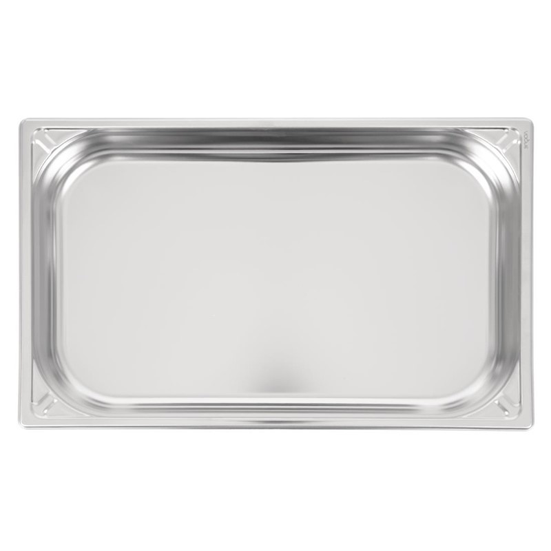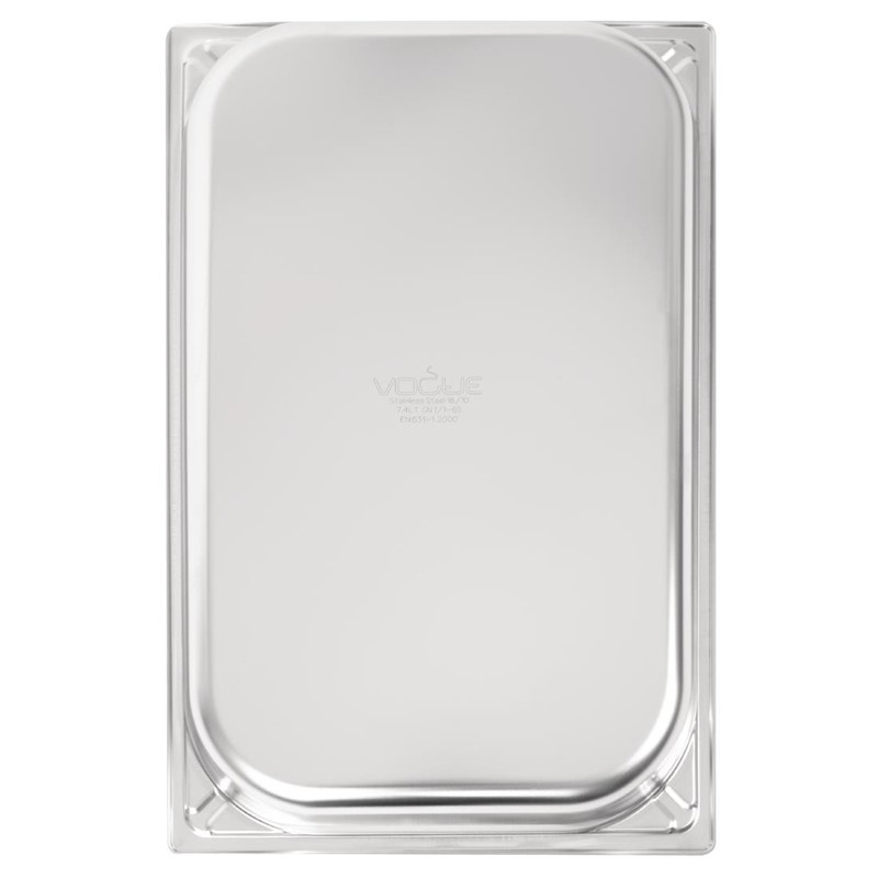 The Vogue stainless steel 1/1 gastronorm pan (65mm/9 litres) is suitable for cleaning in a dishwasher, adding to the convenience of investing in stainless steel gastronorm pans. It's essential that stainless steel pans are regularly cleaned and polished to help maintain their shiny finish.