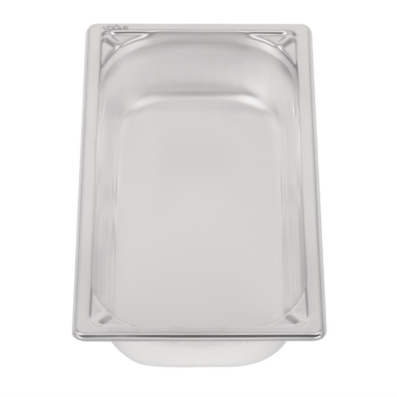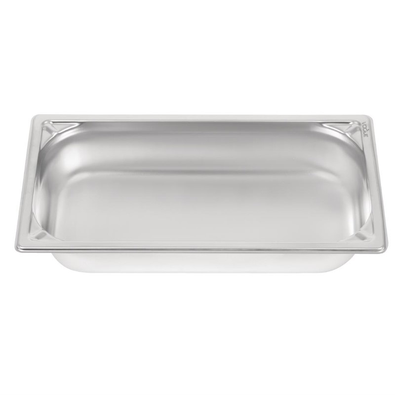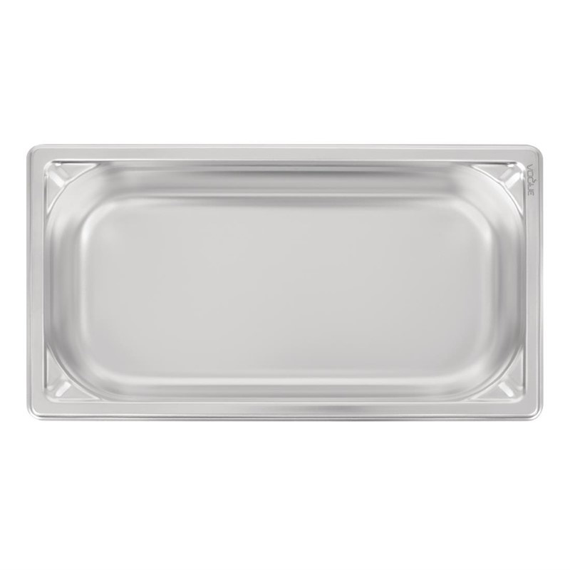 Save yourself the cost and hassle of replacements with this 65mm deep heavy duty 1/3 size gastronorm pan, offering a robust 304 stainless steel construction with reinforced corners. This makes the pan extremely tough and able to stand up to the rigours of very day life in a busy service environment, even if dropped on a concrete floor. The pan is also designed with an overhanging rim which secures it when placed in a prep, buffet station or GN pan rack. Prepare, cook, store and serve food with this GN pan from trusted brand Vogue, which offers a long, reliable service life.