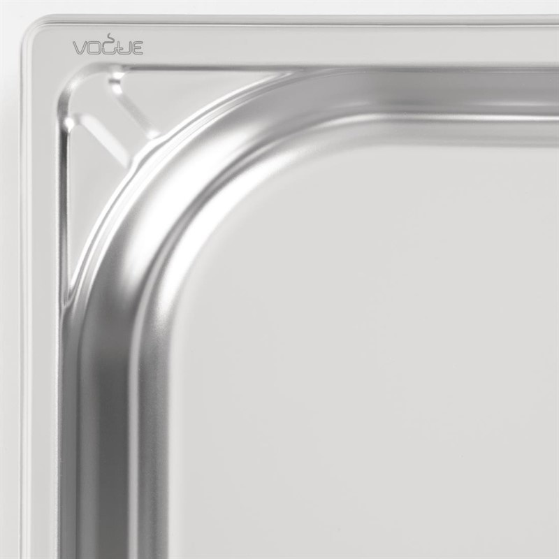 The Vogue stainless steel 1/1 gastronorm pan boasts a sturdy stainless steel construction, allowing it to withstand anything a professional catering environment can throw at it. The stainless steel construction, alongside reinforced corners, ensure this gastronorm pan is resistant to warping and shattering.