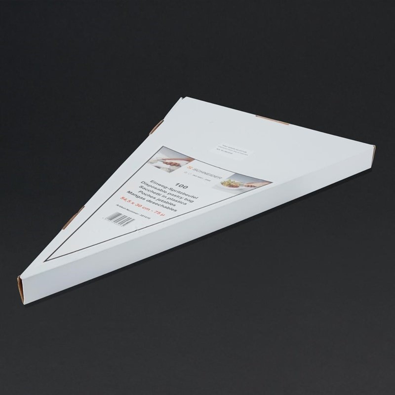 Effortlessly decorate cakes and pastries with these disposable piping bags from Schneider. Each bag is made from polyethylene and has multiple layers with a silky inner that makes it easier to pipe. The transparent design allows you to see how much is left and they can be used with or without a tube. The 100 bags come in a handy box for easy dispense.