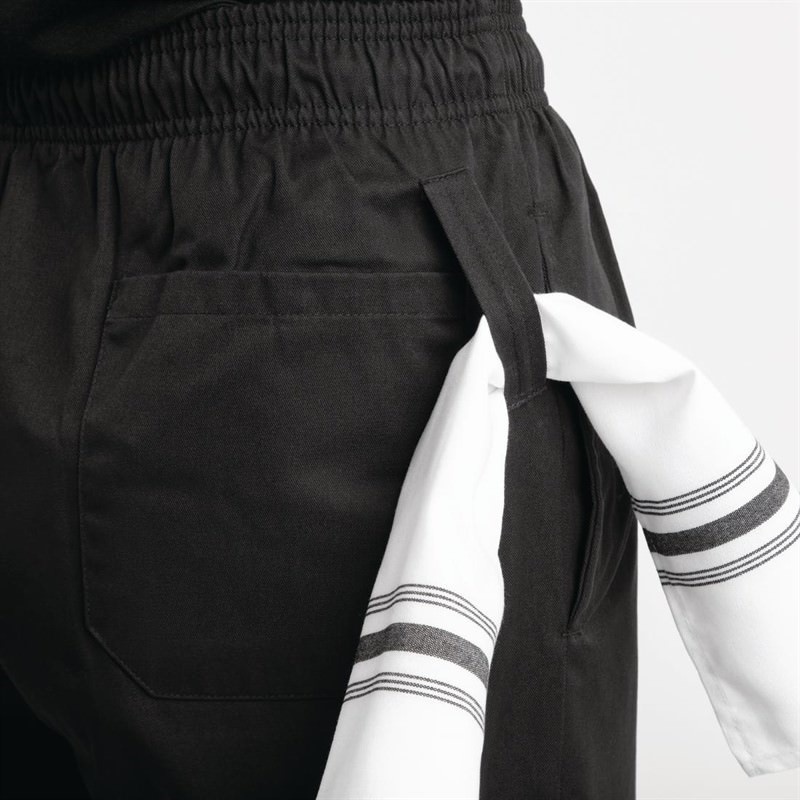 The Teflon trousers offer faster drying times, and better stain resistance to ensure easy laundering. This also means they can repel liquids more easily to prevent staining in the first place. The other advantage of these trousers is a convenient cloth loop which is perfect for tying up a tea towel, or even utensils.