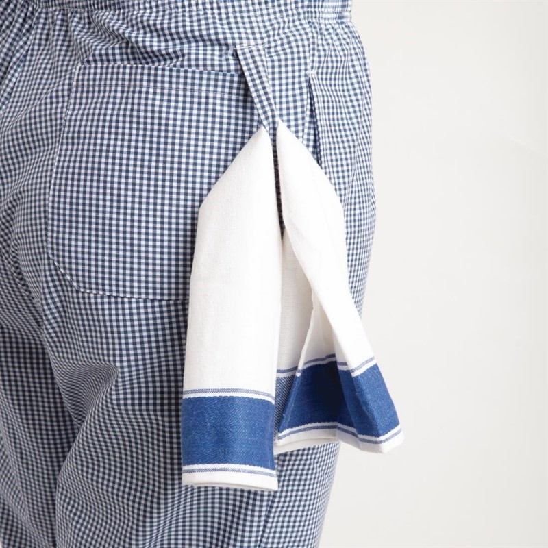 The Teflon trousers offer faster drying times, and better stain resistance to ensure easy laundering. This also means they can repel liquids more easily to prevent staining in the first place. The other advantage of these trousers is a convenient cloth loop which is perfect for tying up a tea towel, or even utensils.