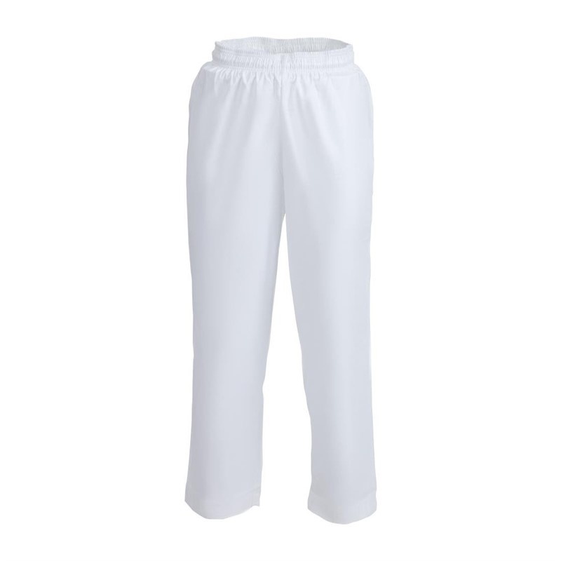 Traditional chefs trousers in a unisex fit. Elastic waistband for a snug, secure fit and all day comfort in the kitchen. The Teflon-coated polycotton material gives you extra protection from spillage. Features back pocket, two side seam pockets and cloth loops.