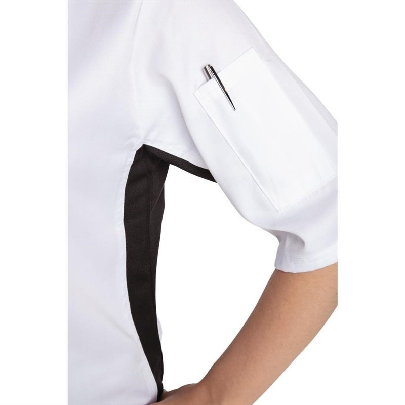 Lightweight and stylish jacket with black contrast details. Advanced moisture-wicking airflow panels help circulate air and move moisture away from the body, keeping you cool and dry in hot, busy kitchens.