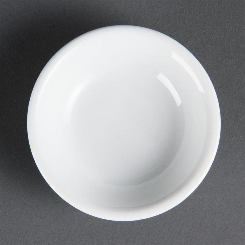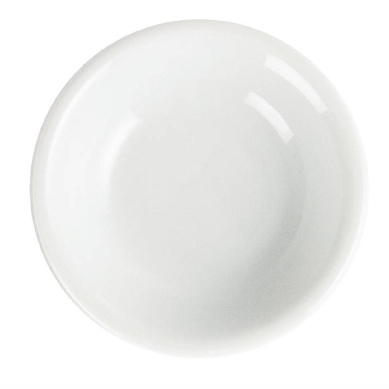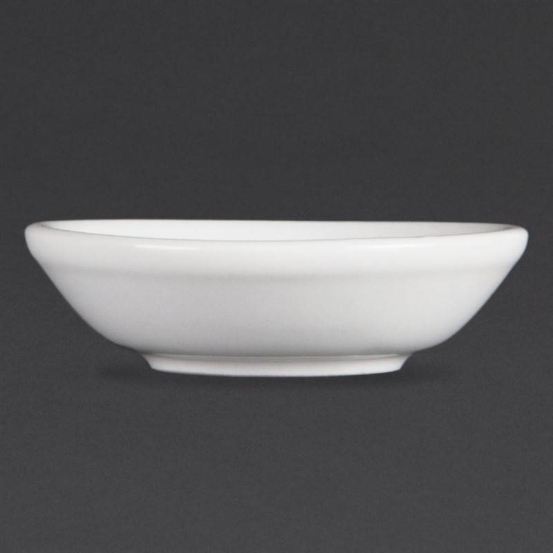 A 4" pure white, porcelain soy dish from Olympia offering a great value option for serving soy sauce. The dish is fully vitrified for heat and shock resistance, ideal for hotels looking for simplicity within their catering crockery.