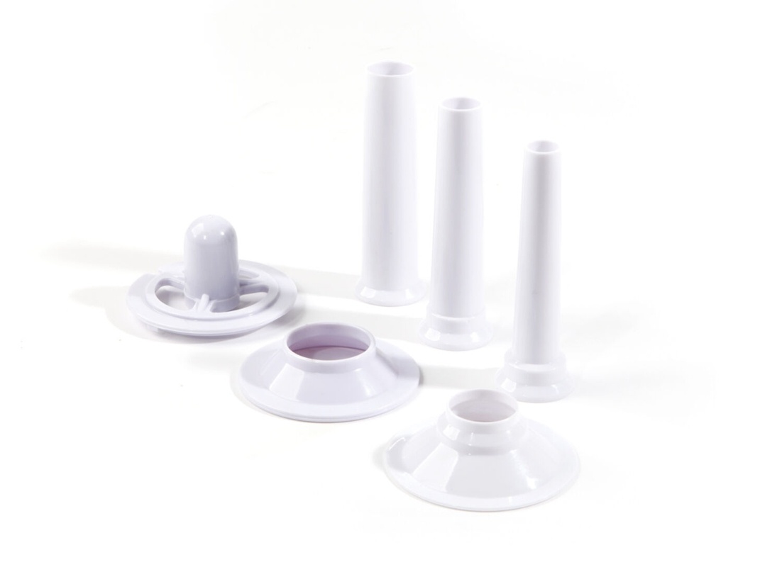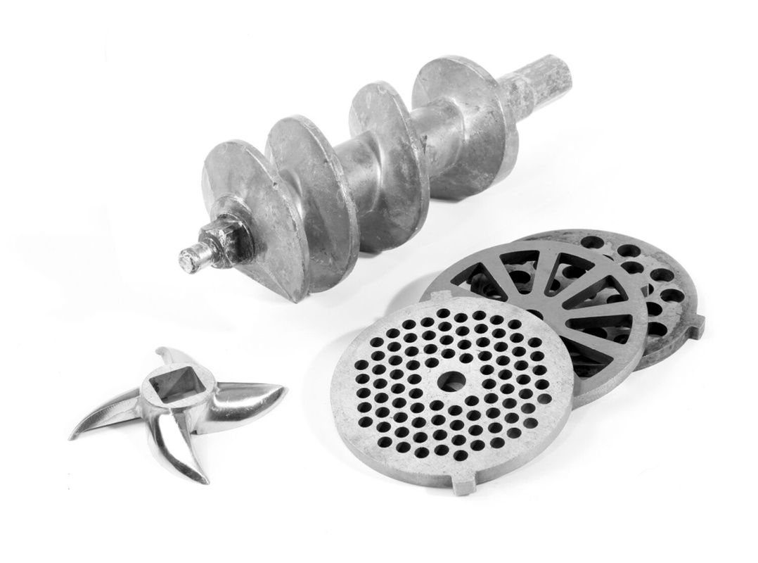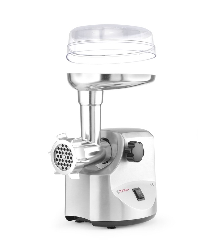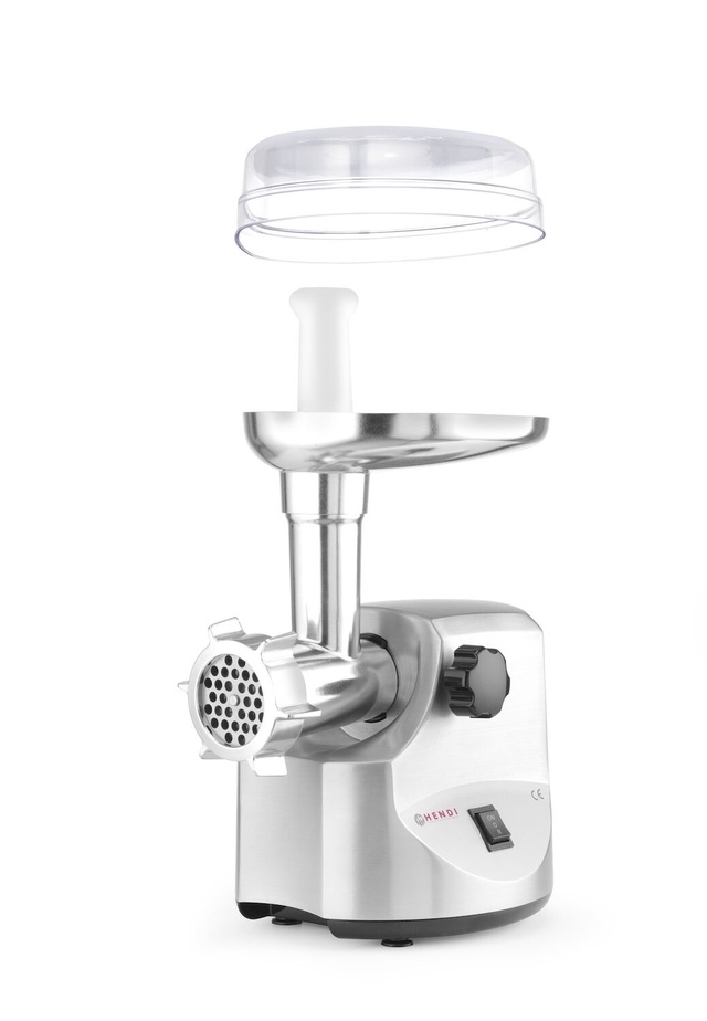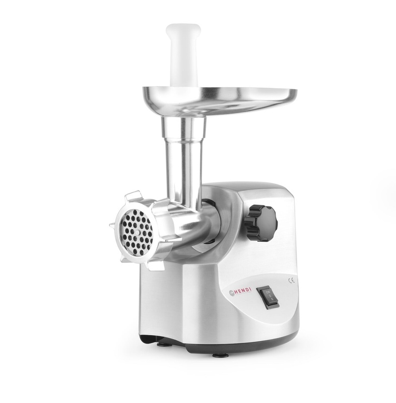 Ideal for small amounts and sausage making, not for commercial use. Aluminium housing. Die cast metal hopper with meat dish/dust cover. Pusher made of plastic. Aluminium worm screw and stainless steel knife. 2 mincing discs, diameter 65,8 mm included: 4 mm and 7 mm diameter holes. 3 sausage stuffing tubes: ø 12, 15 and 20 mm. Steak tartare attachment. On/off/reverse switch. Not for continuous use. Weight 5,2 kg.