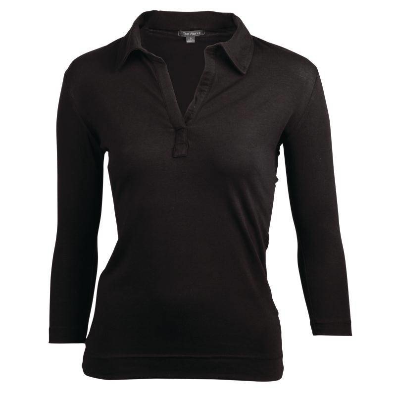 Comfortable Lycra® and polycotton mix waiting tops with flattering cut and loose, V-neck collar. Great for bar and restaurant wear. Suitable for commercial laundering. Size XS-XL.